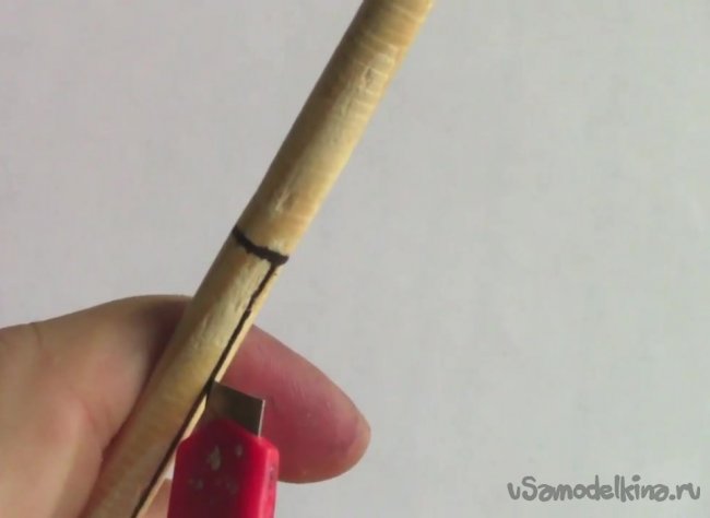 Следующим шагом берем канцелярский нож и у заднего края стрелы делаем небольшую канавку.