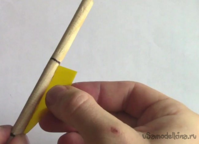 Следующим шагом берем небольшой кусок наждачной бумаги, которой шлифуем заготовку стрелы, придавая ей идеально гладкую поверхность.