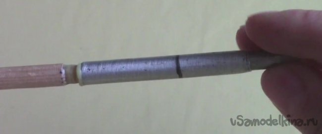 Для этого берем стальную или алюминиевую трубку длиной 5-6 см и делаем метку на деревянной заготовке в половину размера трубки.