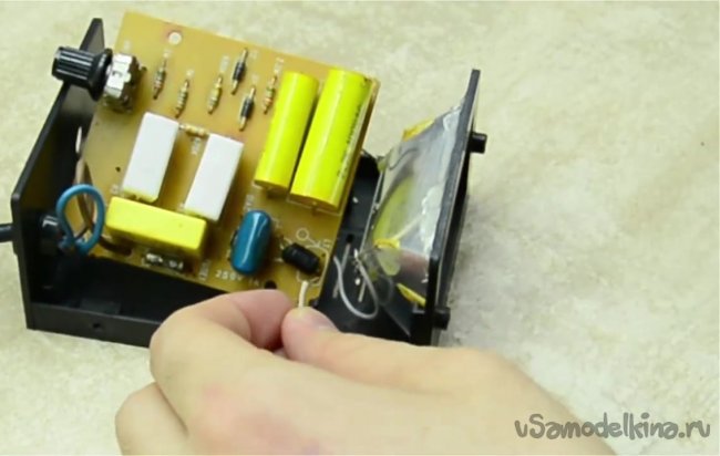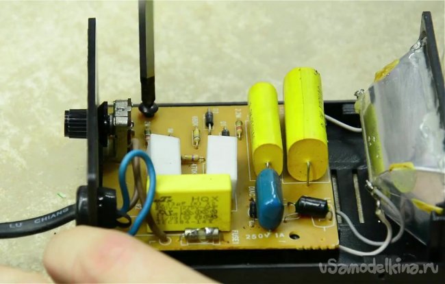 Прежде чем что-либо трогать, необходимо разрядить заводские конденсаторы. Чтобы это сделать можно взять обычный провод и замкнуть их.