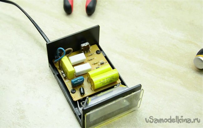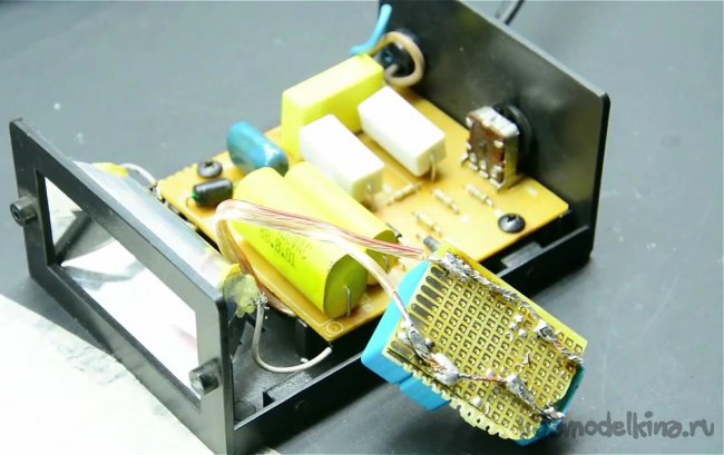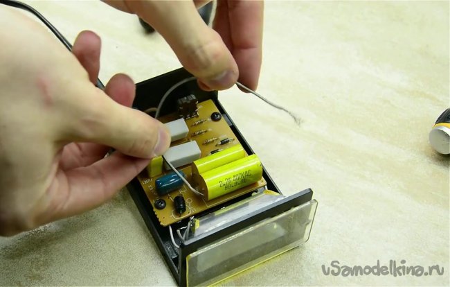 Теперь стробоскоп практически в заводском состоянии, только с него торчит два провода. К этим проводам соединим дополнительные конденсаторы.