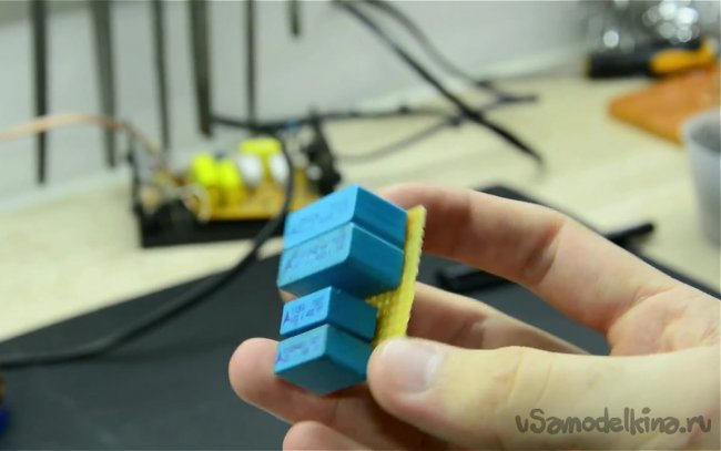 Для достижения большего эффекта, можно соединить сразу четыре конденсатора, которые нужно предварительно спаять между собой.