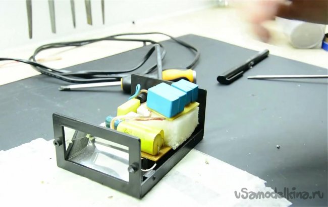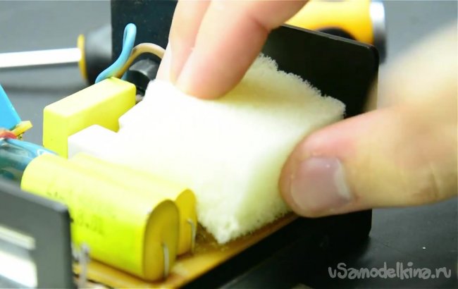 Наконец, полученную конструкцию из конденсаторов кладем в корпус стробоскопа. При желании можно поставить их на кусок поролона, который не позволяет конденсаторам смещаться с места даже при большой тряске.