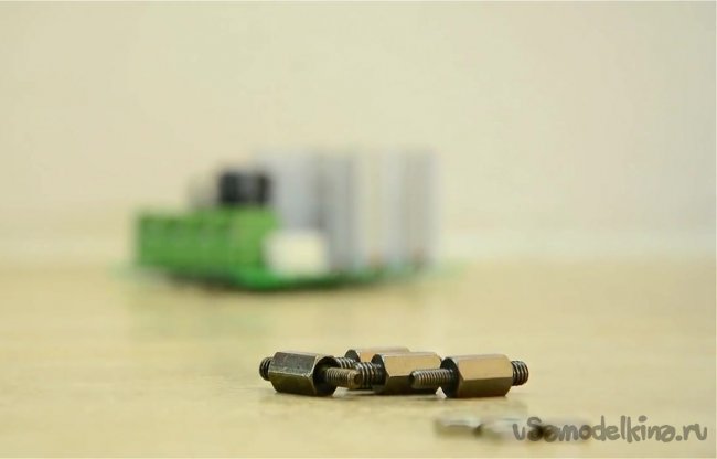 Первым делом необходимо позаботиться о том, чтобы плата не соприкасалась с металлической поверхностью коробки. Для этого можно использовать обычные болты и гайки, которые вкручиваем в заводские отверстия на плате регулятора, таким образом приподнимая ее на несколько миллиметров, что вполне достаточно.