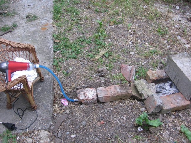 Выкопайте небольшую канавку рядом с костром, а также немного под ним тоже. Уложите железную трубу. Укладывал автор ее так, чтобы под кострище поступал воздух из отверстия на конце самодельного фена для раздувания огня.