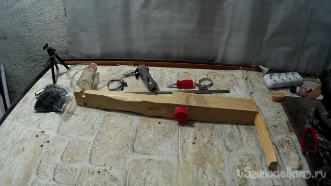 Далее нужно просверлить отверстие на большом деревянном бруске, чтобы вывести вторую часть трубки.