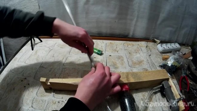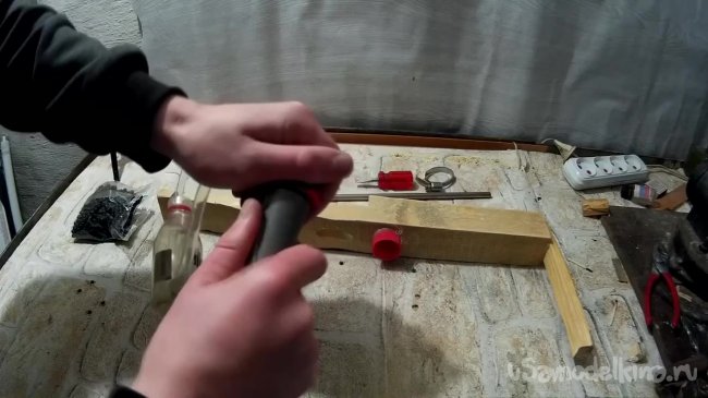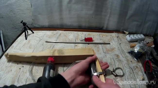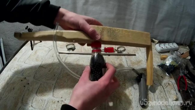 Теперь нужно зафиксировать устройства для баллончиков CO2 на маленьком бруске. Делать это будем хомутом.