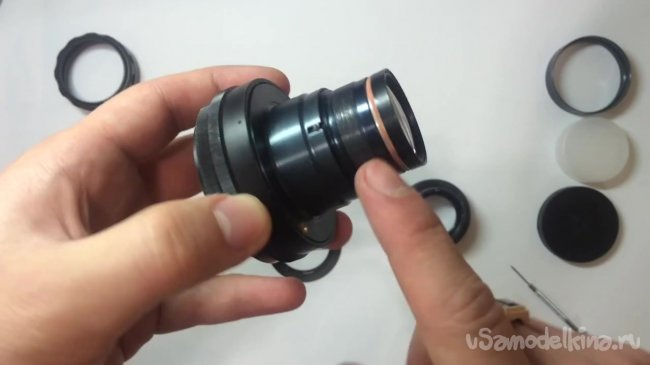 После откручивания болтиков объектив начинает спокойно вращаться. Снимаем крышку и откручиваем линзу.
