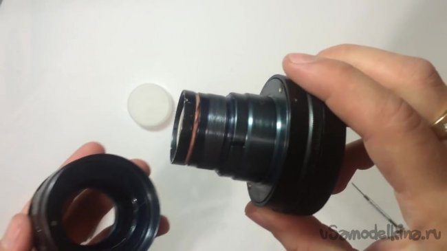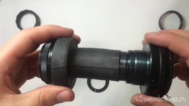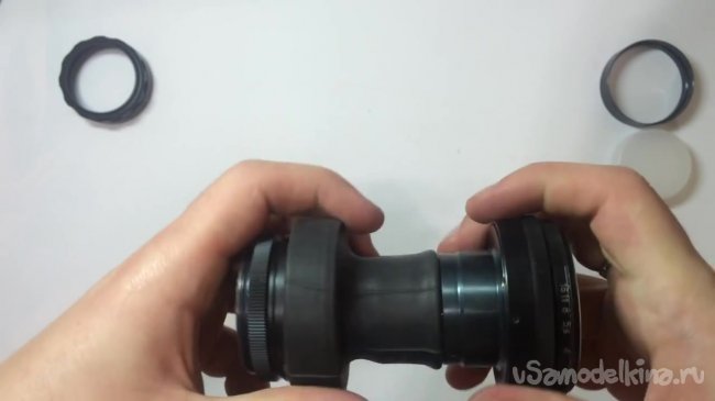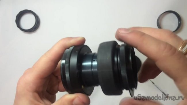 Начинать нужно со второго конца резиновой камеры нужно надеть на большую часть заднего элемента объектива.