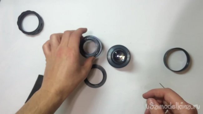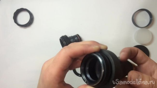 Итак, после несложных действий разборки линзы, можно перейти к следующему шагу. На этом этапе нам понадобится линза, переходник, задняя часть и кусок велосипедной камеры, который мы отрезали в самом начале.