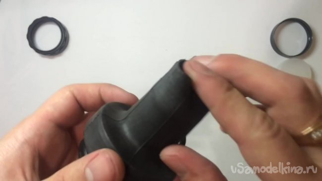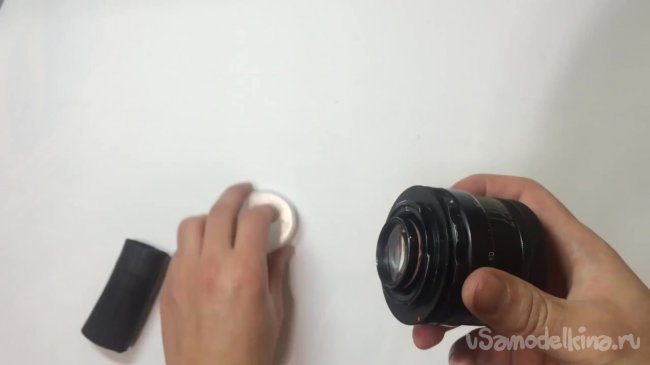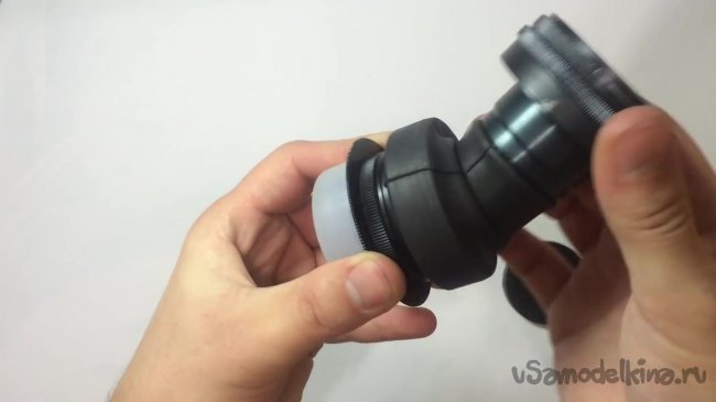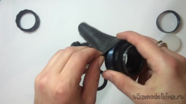 Необходимо соединить линзу с задней частью куском велосипедной камеры. Следует отметить, что резинку нужно надевать не полностью, а на узкую часть линзы.