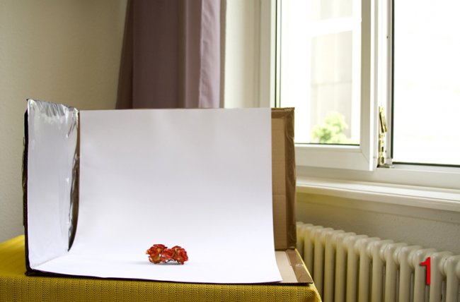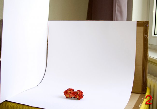 Впрочем, при необходимости, всегда можно поставить на это место лист белой бумаги (фото 2). Преимущество такой переносной конструкции налицо – обратите внимание, свет из окна падает справа, но если при ваших условиях свет должен падать слева, достаточно «студию» повернуть на другой бок!