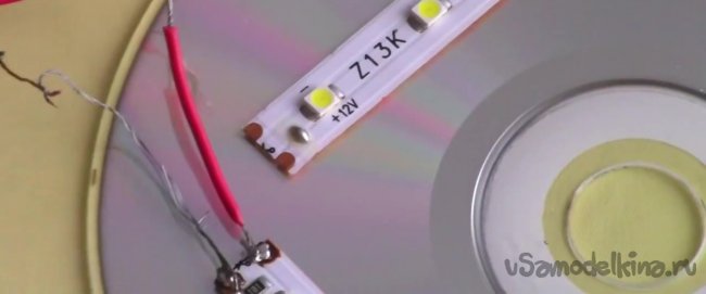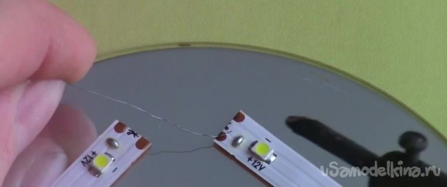 Берем провод и делим его на тонкие жилья. При помощи полученных проводков нам необходимо соединить между собой куски светодиодной ленты, которые приклеили на диск.