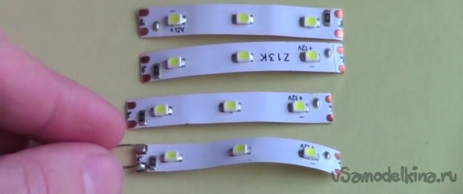 Берем светодиодную ленту и режем ее на четыре ровные части, оставляя по трем светодиодам на каждой из полученных кусков.