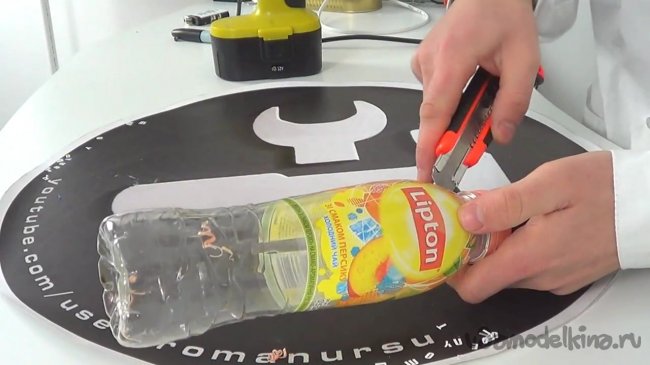 Берем канцелярский нож и отрезаем этикетку. Тут следует отметить, что автор советует использовать прозрачную бутылку, чтобы на этом шаге можно было увидеть, что нужно резать.