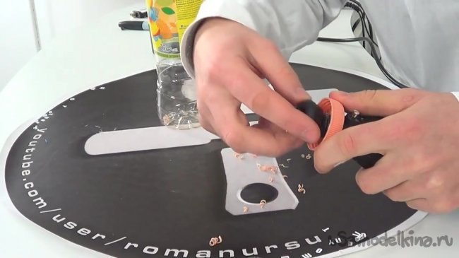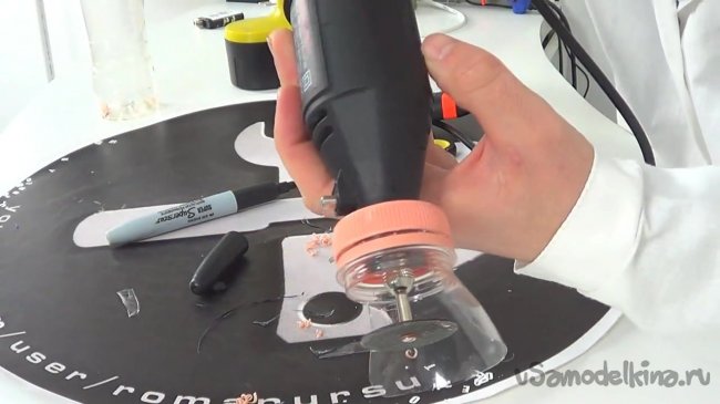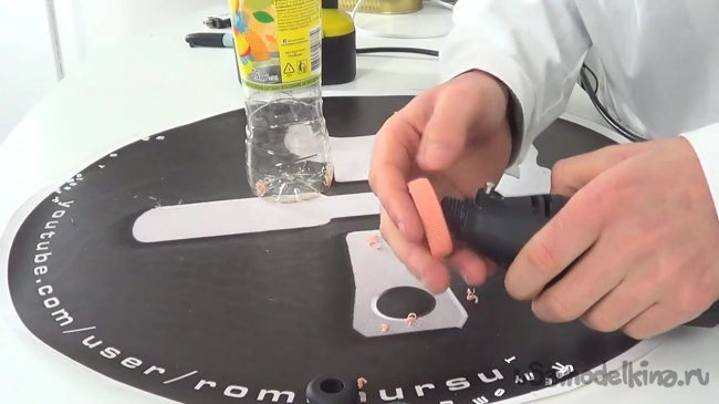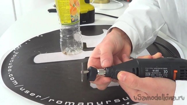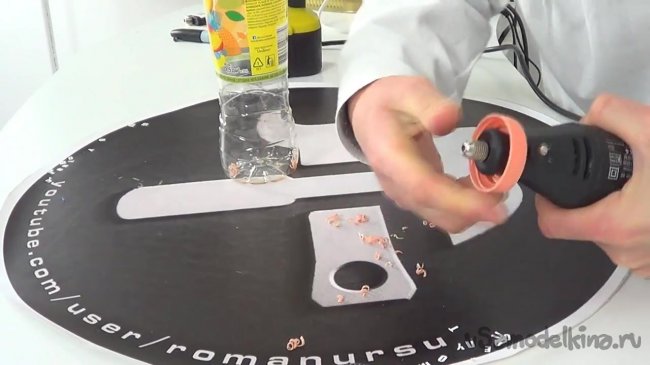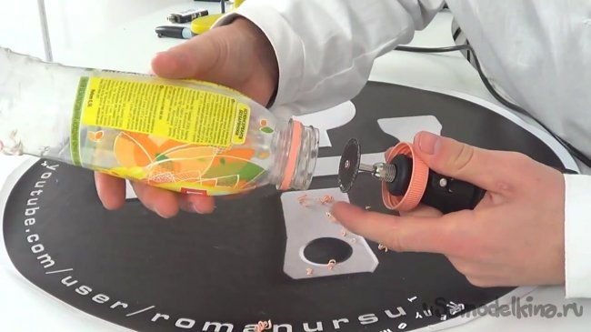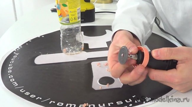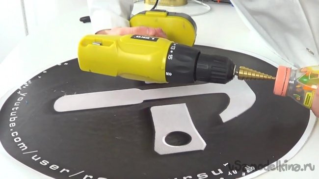 Берем шуруповерт и надеваем на него насадку елочку и просверливаем отверстие на крышке бутылки. Диаметр просверливаемого отверстие должен быть равен диаметру резьбы, на которую закручивается пластиковое кольцо на верхней части Dremel.