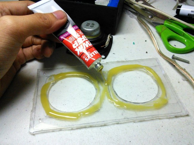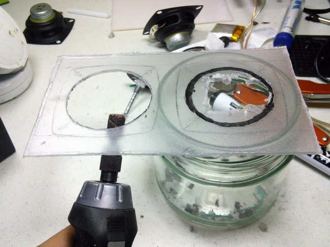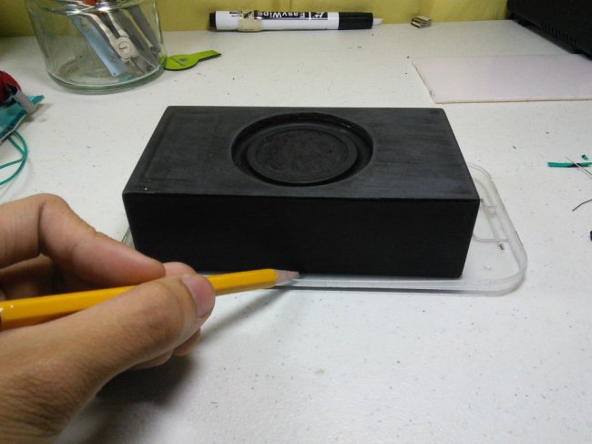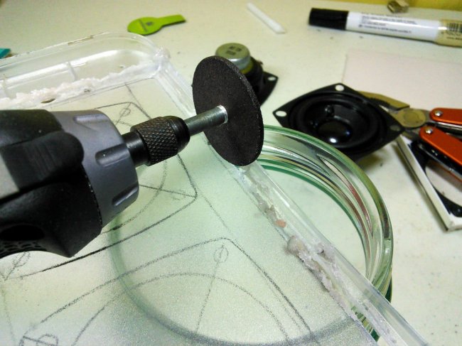 Вам понадобится передняя панель динамика – ее можно изготовить из куска прозрачного пластика. Простым карандашом нанесите на пластик разметку и вырежьте отверстие для динамика нужного размера. Так же отрегулируйте общий размер панели.