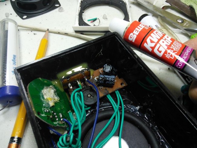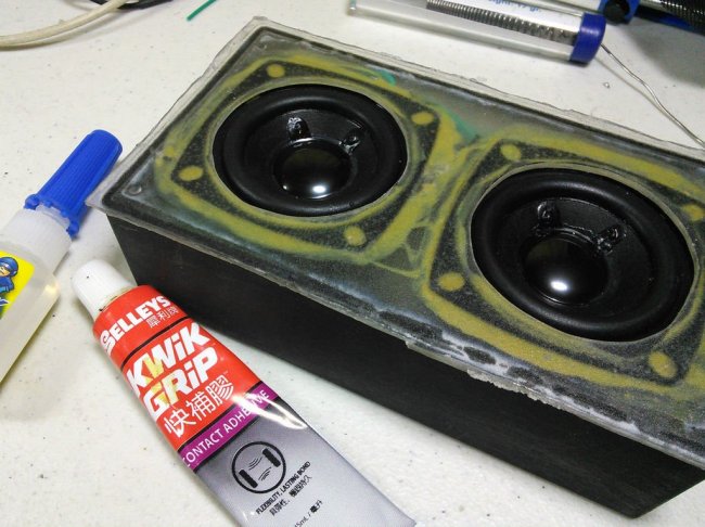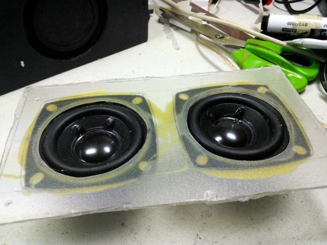 Закрепить динамики на импровизированной панели можно с помощью строительного клея.