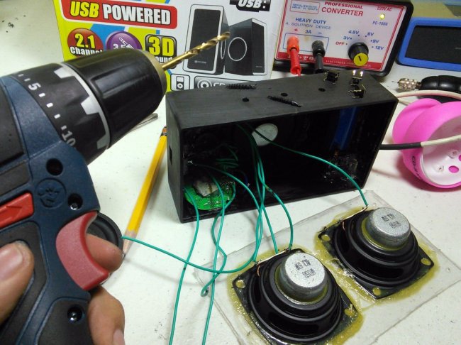 К динамикам нужно подвести и припаять провода от усилителя (не забывайте о полярности).