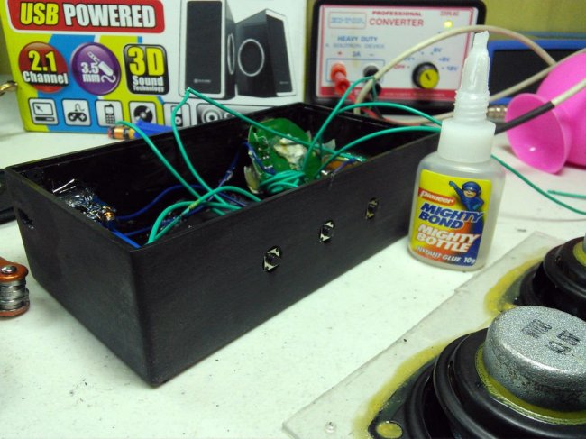 Теперь нужно закрепить кнопку для переключения колонки: отмерьте на корпусе отверстие для ее расположения, вырежьте отверстие необходимого размера и закрепите при помощи суперклея.
