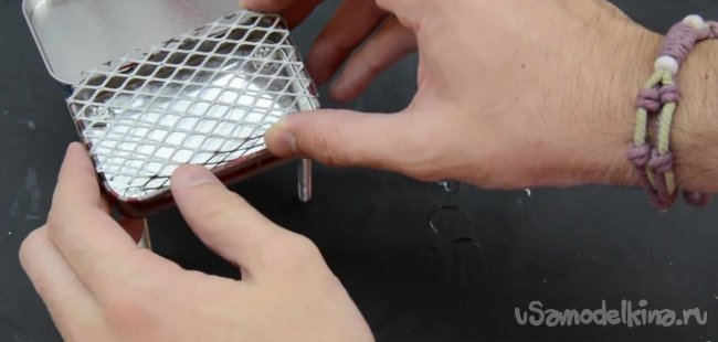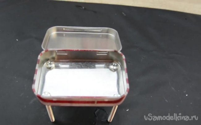 Первым делом берем коробочку и проделываем в ней четыре отверстия по краям, в которые будут установлены ножки мангала.