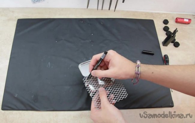 В качестве сетки можно использовать защитную сетку от динамиков или что-то удобное. При помощи маркера отмечаем места разрезов.