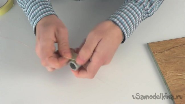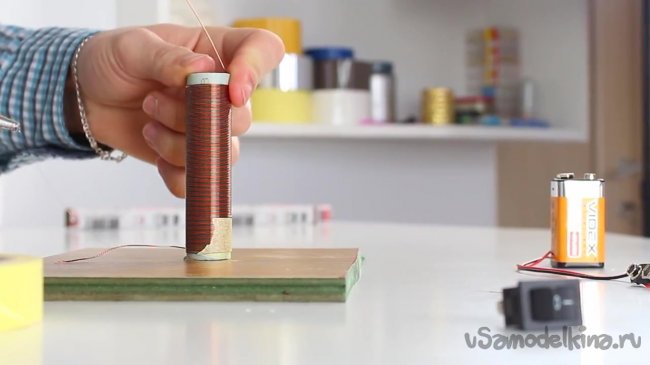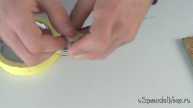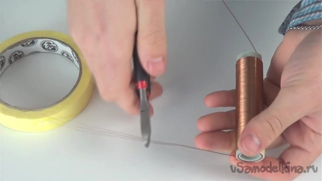 После того, как намотали проволоку, фиксируем также второй конец бумажным скотчем, чтобы проволока не наматывалась. Вырезаем конец проволоки кусачками. Катушка готова.