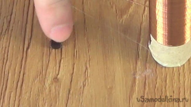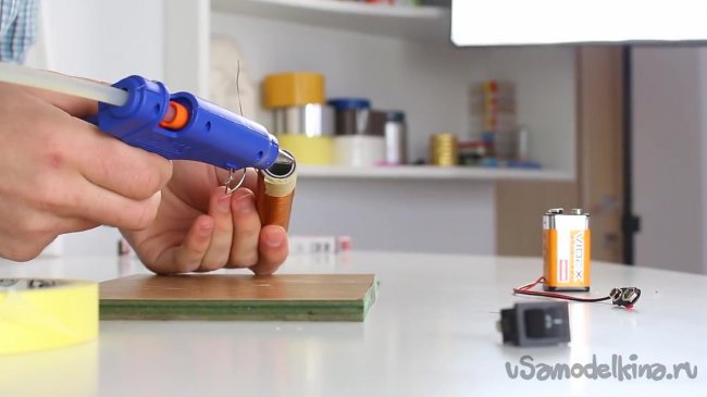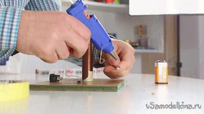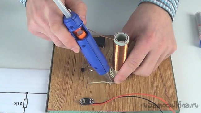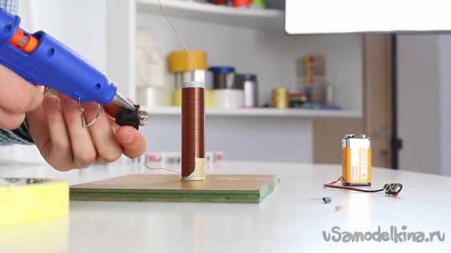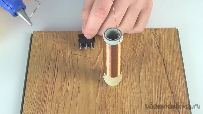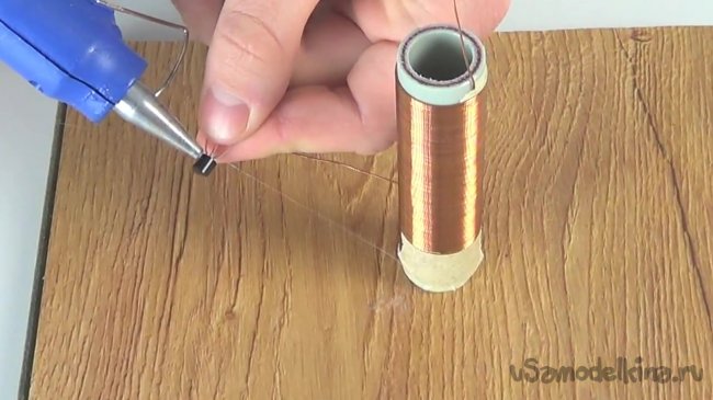 Кусок провода нам понадобится для вторичной обмотки. Его обматываем два раза вокруг катушки и фиксируем оба конца провода при помощи термоклея на основе.