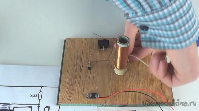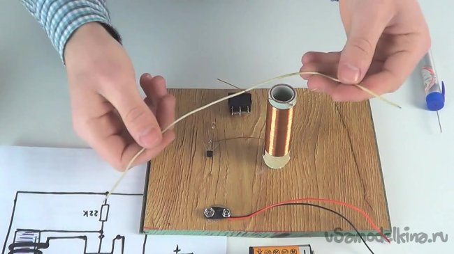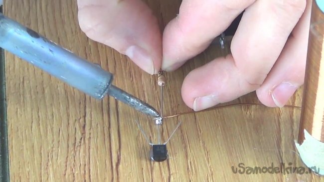 Второй конец провода вторичной обмотки припаиваем к правому контакту на транзисторе. Для облегчения работы можно воспользоваться короткими отрезками проводков.