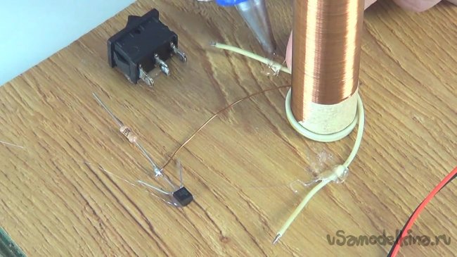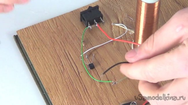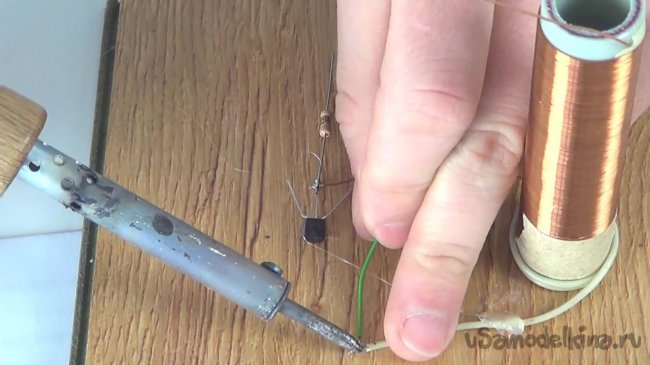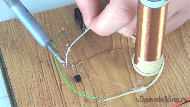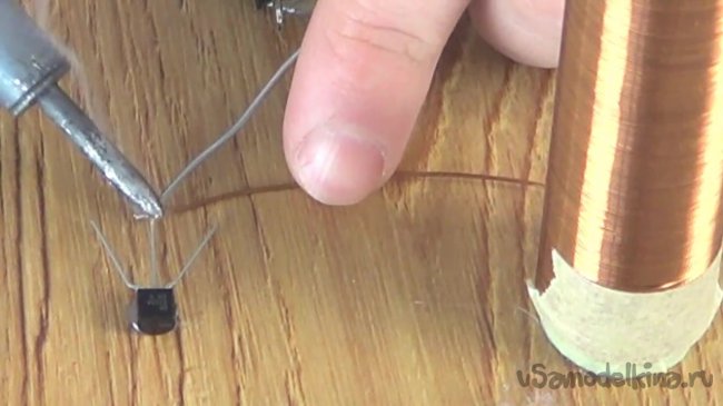 Переходим к подсоединению проводов. Нижний медный провод, идущий от катушки припаиваем к среднему контакту на транзисторе.