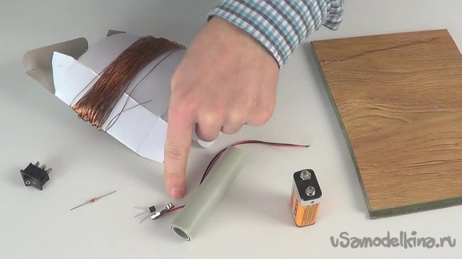 На куске ламината также приклеиваем выключатель, транзистор и коннектор кроны.