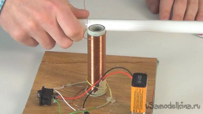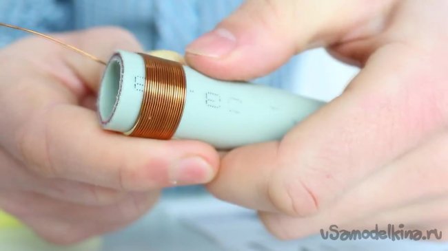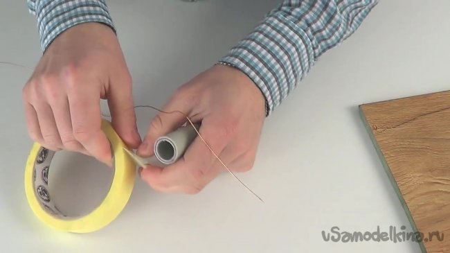 Первым делом мы должны намотать медную проволоку на ПВХ трубку, отступая от краев приблизительно на 0.5 см. Для того, чтобы сначала проволока не отматывалась, автор идеи советует зафиксировать ее конец бумажным скотчем.