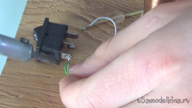 Далее контакты от резистора вместе с проводом от вторичной обмотки припаиваем к контакту от выключателя.