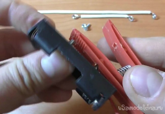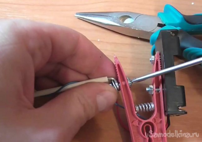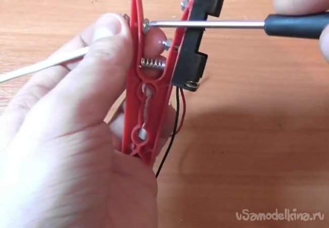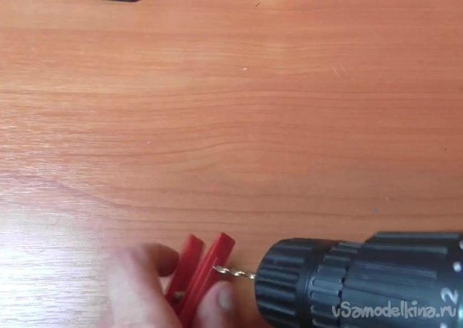 Далее необходимо проделать два отверстия в прищепке. Для этого берем шуруповерт и сверло. Отверстия необходимы для того, чтобы прикрепить батарейный отсек винтиками, поэтому при сверлении необходимо обратить внимание на расстояние отверстий.