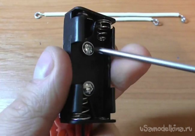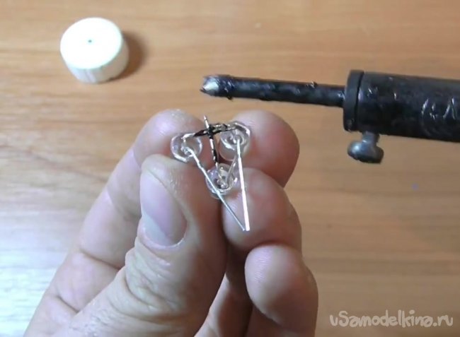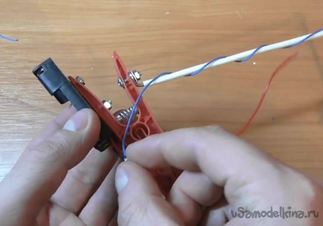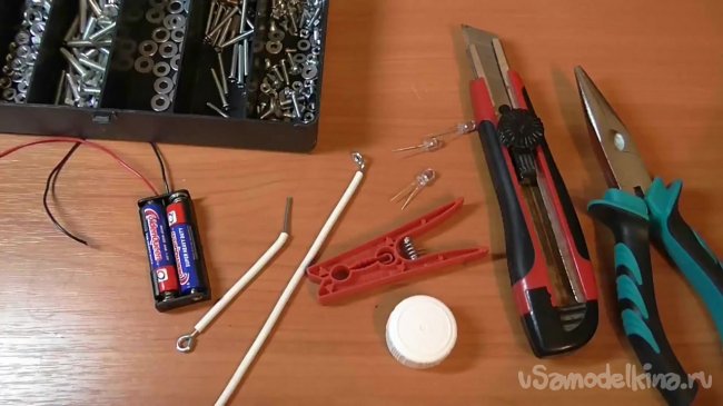 Плюс от светодиодов можно подключить к винтику. Таким образом плюс будет идти через всю конструкцию из проволоки, благодаря чему плюс от батареек нужно будет соединить с винтиком на прищепке.