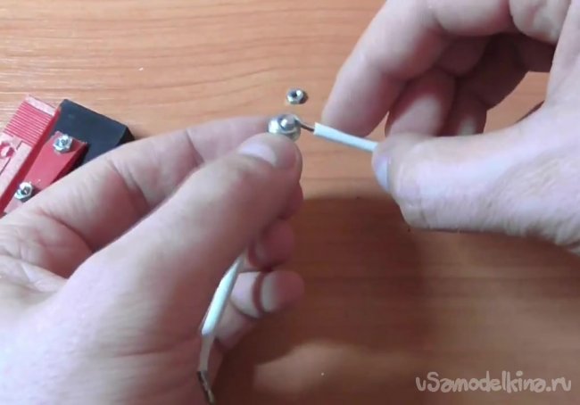 Теперь нужно соединить две проволоки. Для этого кладем колечки на концах проволок друг на друга и просовываем винтик и гайку, зафиксировав в таком положении.