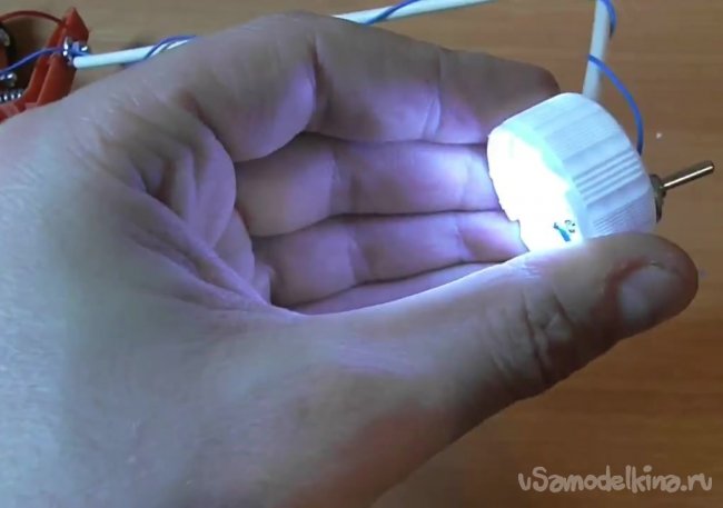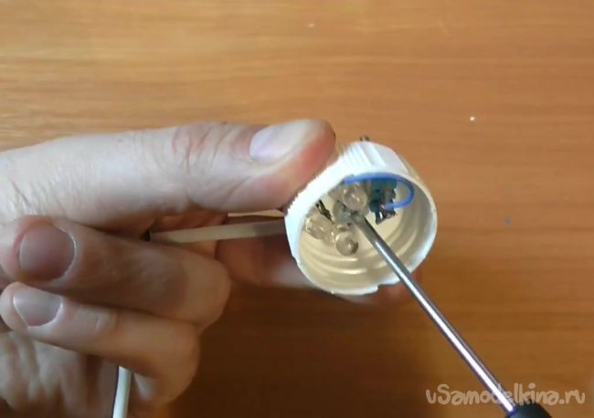 Прикрепляем светодиоды внутри крышки, просунув провода через отверстие, которое просверлили вначале. Вместе с проводами просовываем в отверстие еще один винтик.