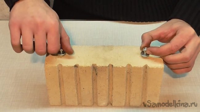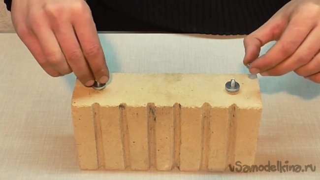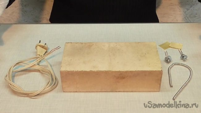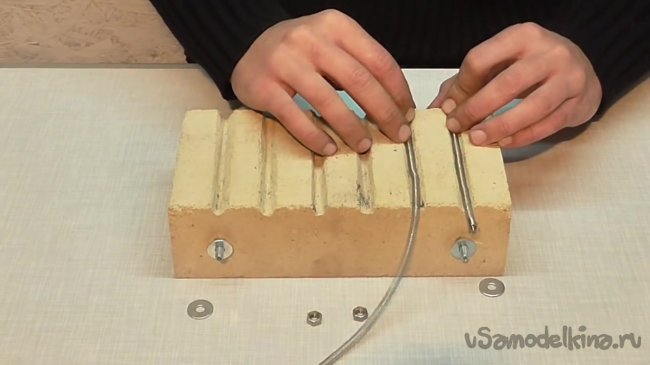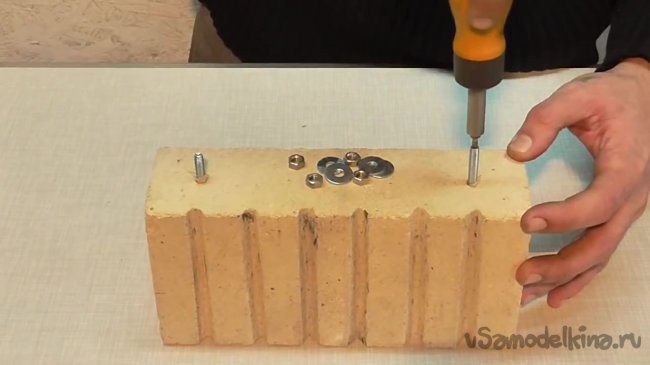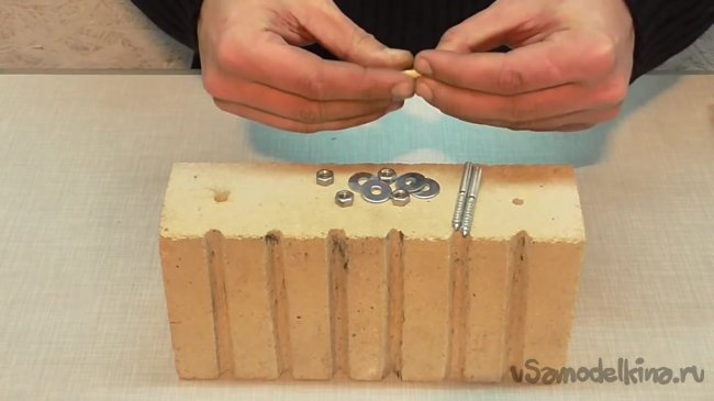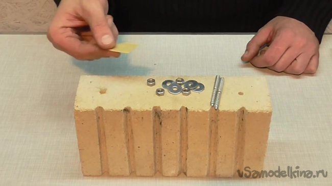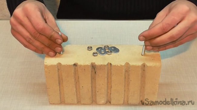 Стеклоткань будет использована для уплотнения шурупов. По словам автора, нет смысла использовать пластмассу, поскольку кирпич будет разогреваться, и пластмасса просто выгорит. Приступим.