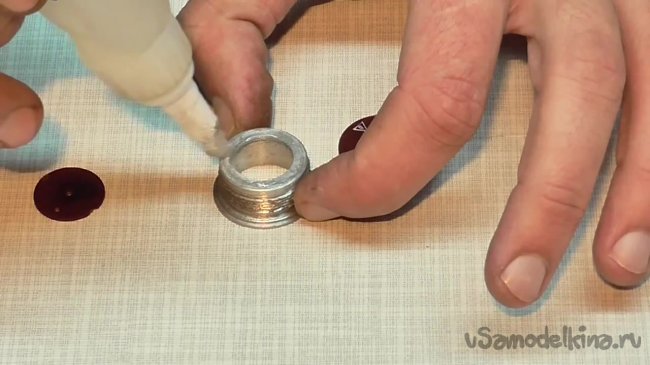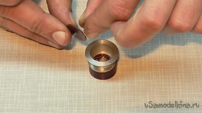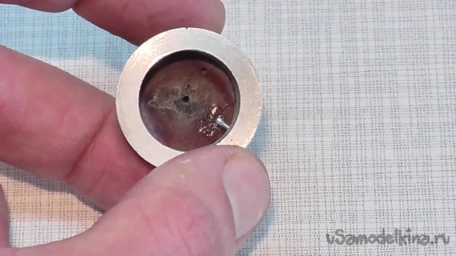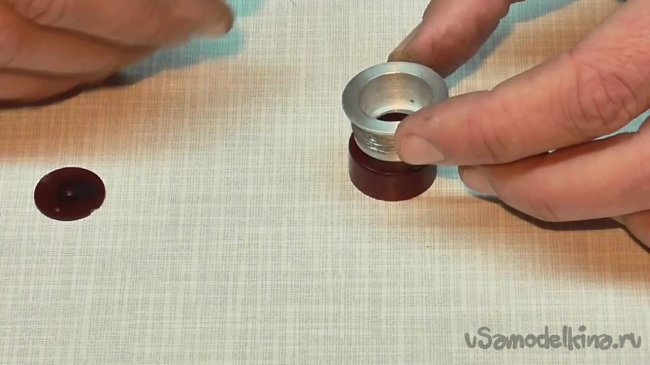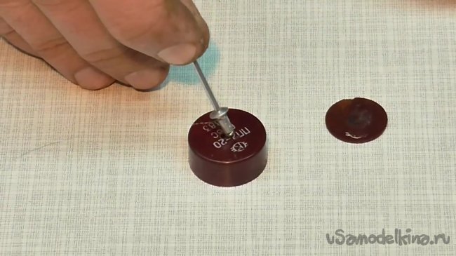 Также нам понадобится сделать небольшую шайбу заглушку. Для этого можно использовать еще одну крышку переменного сопротивления. На ней проделываем небольшое отверстие посередине.
