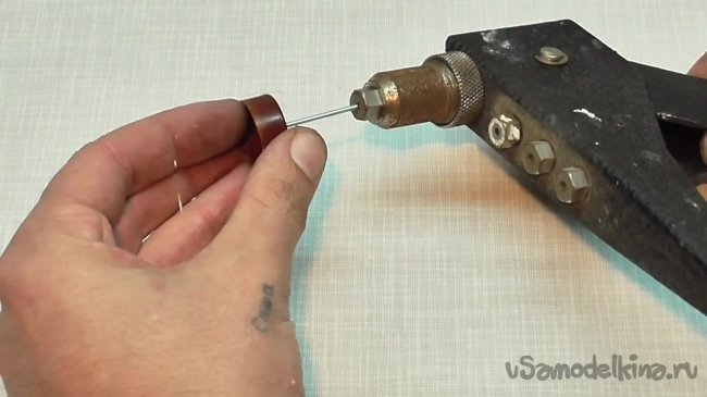 Затем вставляем заклепку в отверстие и прессуем ее.