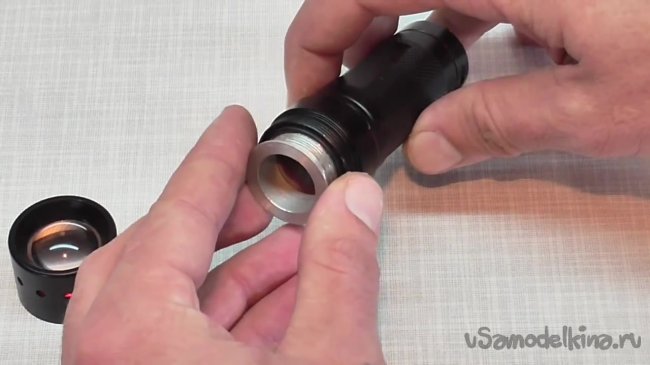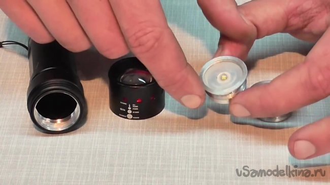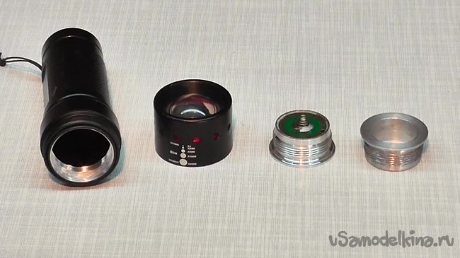 Начнем с разборки фонарика. Автор идеи использует обычный светодиодный фонарик. В начале он изготавливает деталь, которая служит корпусом для лампочки, однако этот шаг можно пропустить, использовав заводскую деталь.