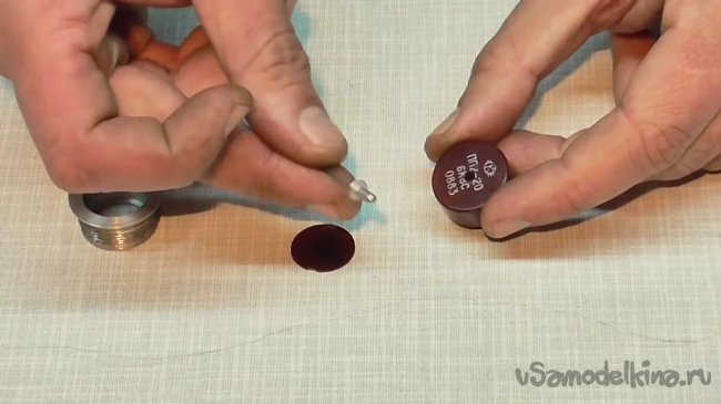 Просовываем нихромовую нить через отверстие на заглушке. Вставляем заглушку в корпус для лампочки.