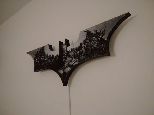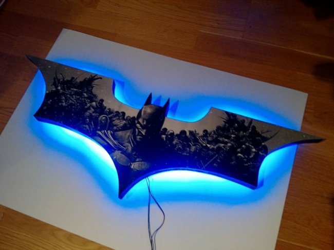 Если нет уверенности, в способности качественно создать своими руками будущий шаблон (здесь это символ Бэтмена), можно легко воспользоваться принтером. Когда шаблон успешно изготовлен, то его необходимо нанести на плиту МДФ. Для производства уже основной заготовки понадобится электролобзик. Сама плита довольно хрупкая, поэтому категорически нужно отказаться от пил с мелкими зубьями.