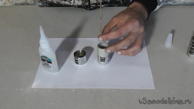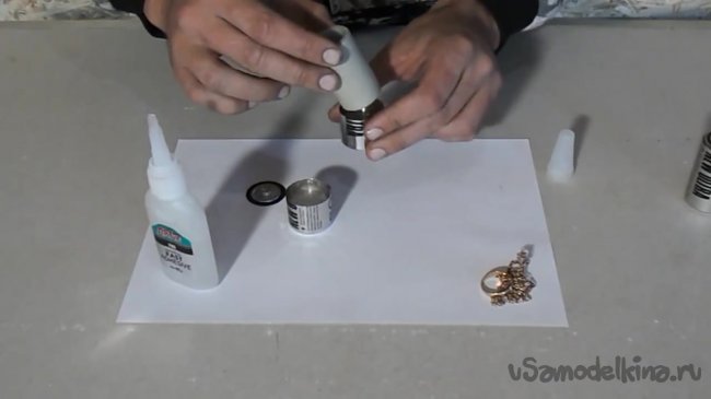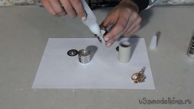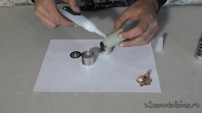Затем берем кусок полипропиленовой трубы, которая также должна подходить по диаметру, наносим клей и вставляем в половинку батарейки, в которую на предыдущем шаге приклеили шайбу.