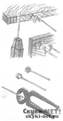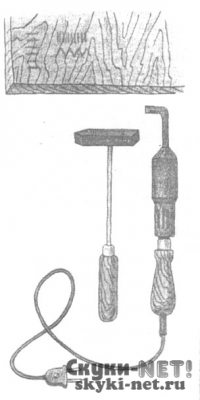 Некоторые умельцы довольно искусно украшают деревянные утварь, полки узорами, выполненными выжиганием. Дело не такое уж сложное, но все же поучиться стоит, тем более, что можно иметь дело с электрическим паяльником. Впрочем можно работать и простым паяльником, раскалив его на огне газовой горелки или другом открытом огне. Такие паяльники обычно имеют форму небольшого молотка, поэтому передней плоскостью выжигают квадраты, боковой плоскостью -прямоугольники, а заостренной стороной наносят мелкие штрихи. Да что паяльники, приспосабливают под них и обычные вязальные спицы. Их тоже нагревают на открытом пламени или в огне печи, а затем берут щипцами, а еще лучше плоскогубцами, и выжигают намеченный узор. Под это дело можно приспособить и половину пряжки от пояса или нечто подобное, а то и шляпки крупных гвоздей, только сперва их надо будет подготовить к выжиганию узоров. Шляпку затачивают напильником, придав ей форму звезды или треугольника. Если взять гвозди разных размеров, то получим штампы, которыми можно выполнять самые причудливые сочетания узоров. Обратите внимание и на металлические кольца. Ими наносят круглые очертания на рисунке. Берут кольца различной величины в сочетании с соответствующим держателем.