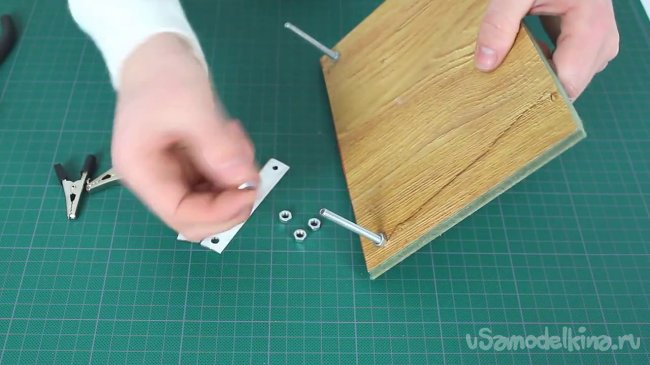 Шаг 1: Первым делом мы должны просверлить в куске ламината или фанерки 2 отверстия под болтики.