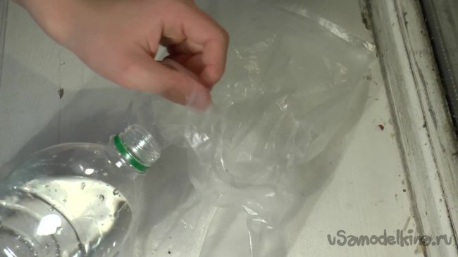 Берем полиэтиленовый пакет и набрать в него воды. Делать это нужно предельно осторожно, чтобы пакет не намочился снаружи. Делать это удобнее при помощи бутылки, для этого предварительно наполняем бутылку водой. Наливать воду нужно так, чтобы размер пакета с водой был меньше кулака.
