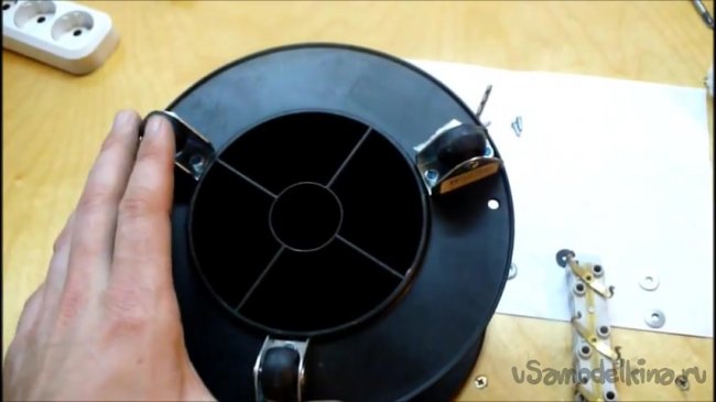 Переворачиваем катушку и отмечаем места прикрепления колесиков. Просверливаем все необходимые отверстия по меткам и монтируем элементы, то есть дно колодки и колесики. Тут следует отметить, что болты, фиксирующие дно колодки, должны быть расположены так, чтобы не мешать дальнейшей установке рабочих элементов.