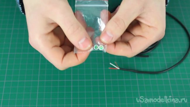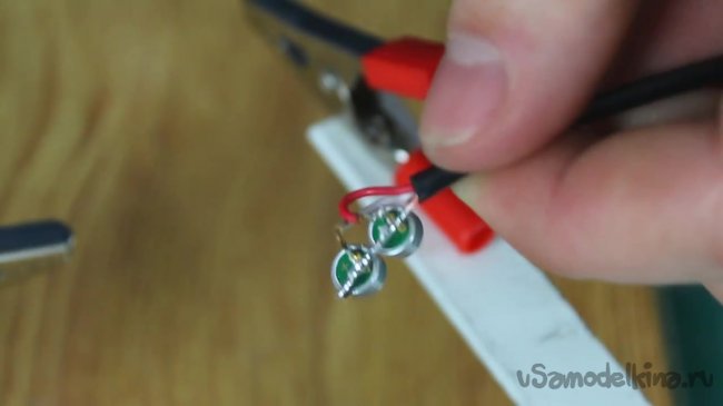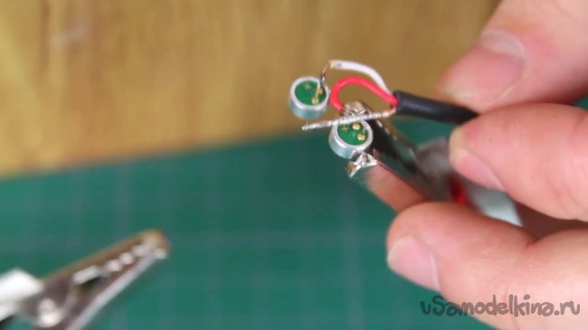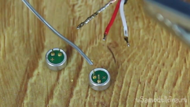 Полученные три провода нужно припаять к двум микрофонам. На микрофонах есть плюс и минус, так что припаиваем красный или белый провода к плюсам микрофонов.