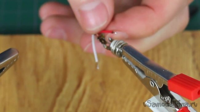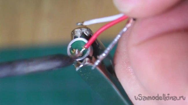 Первым делом мы должны припаять провода к мини джеку. Толстый медный провод нужно припаять к середине джека, цветные провода – по бокам. По словам автора, не имеет разницы, с какой стороны какой цвет припаивать.